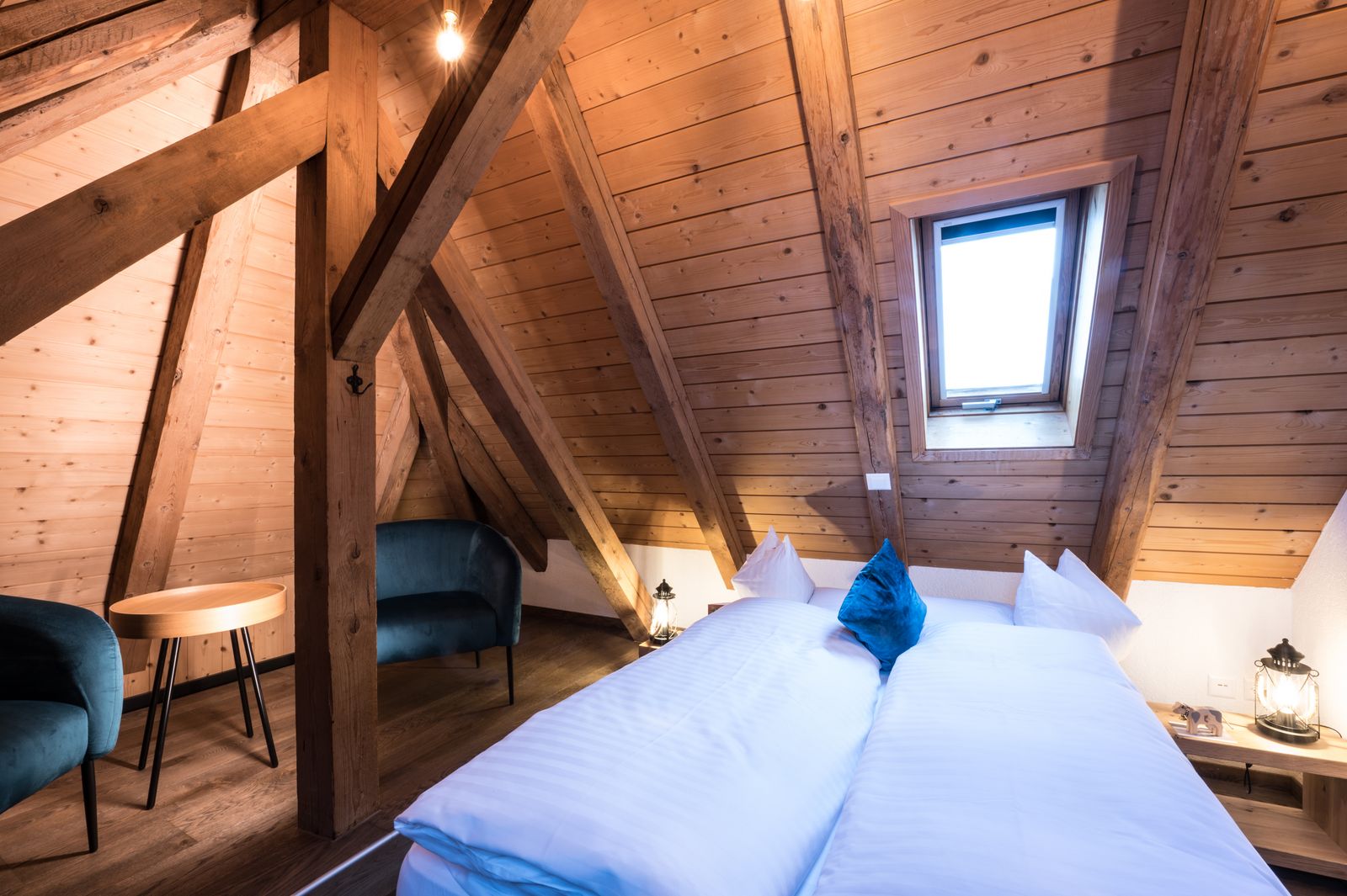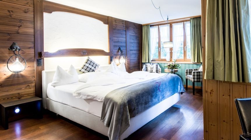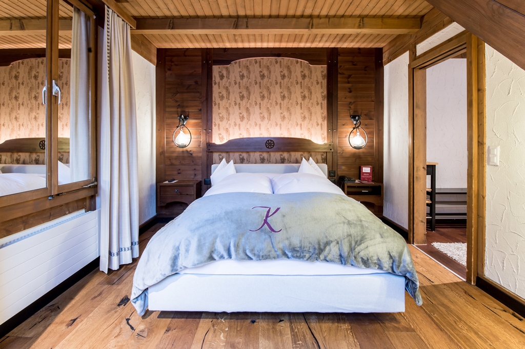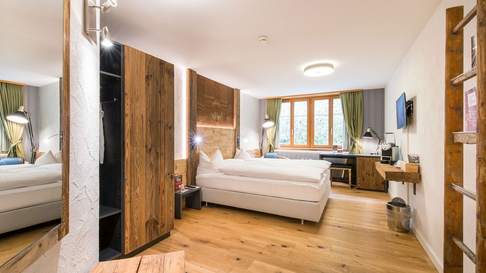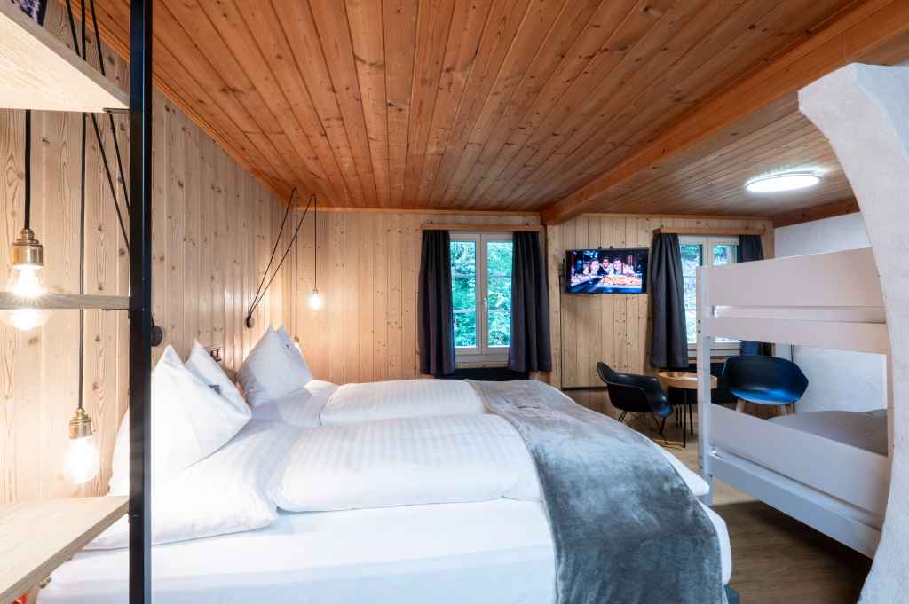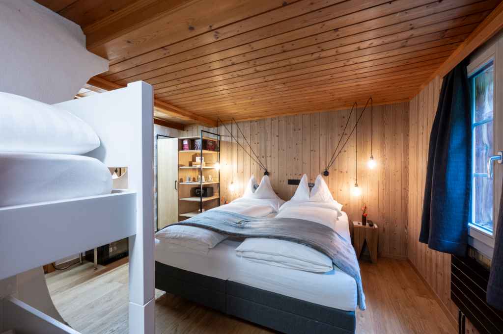 Das Familienzimmer im Stöckli (ca. 20 m2) eignet sich für eine vierköpfige Familie. Es ist mit einem Boxspring-Bett von Selecta und einem Etagenbett ausgestattet. Das Badezimmer ist mit Dusche und Haartrockner ausgestattet. Das Zimmer verfügt über Telefon, Radio/TV und Internetzugang.