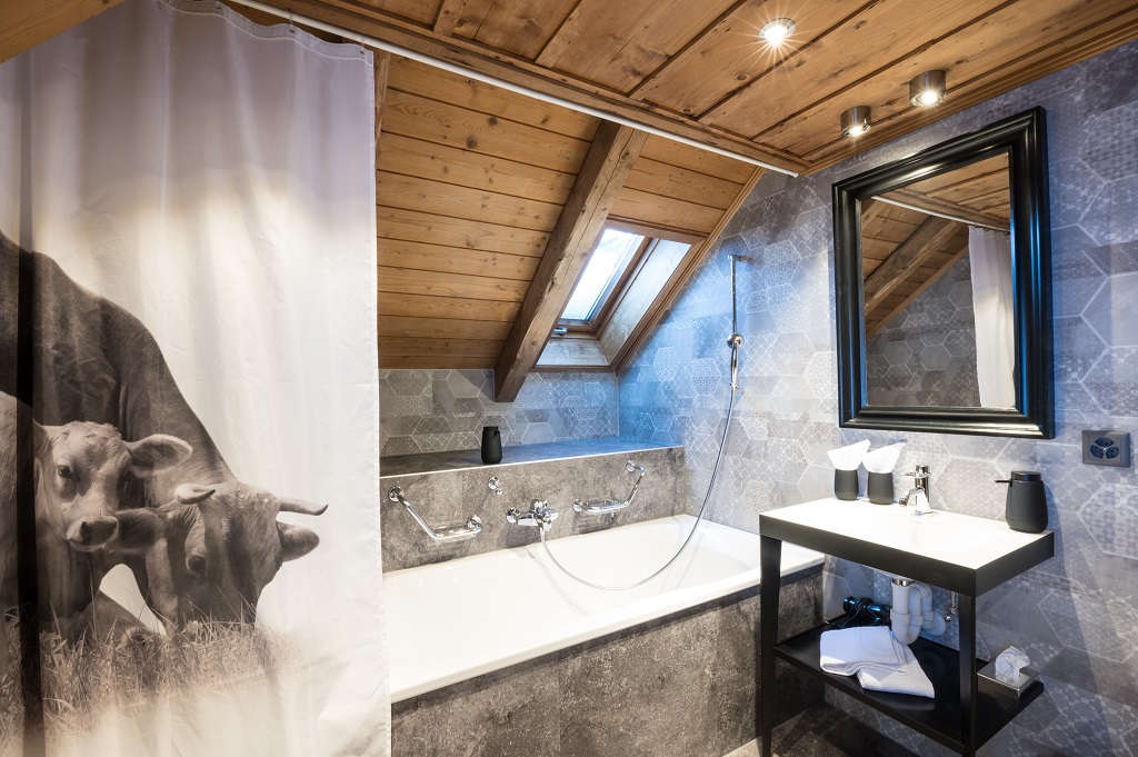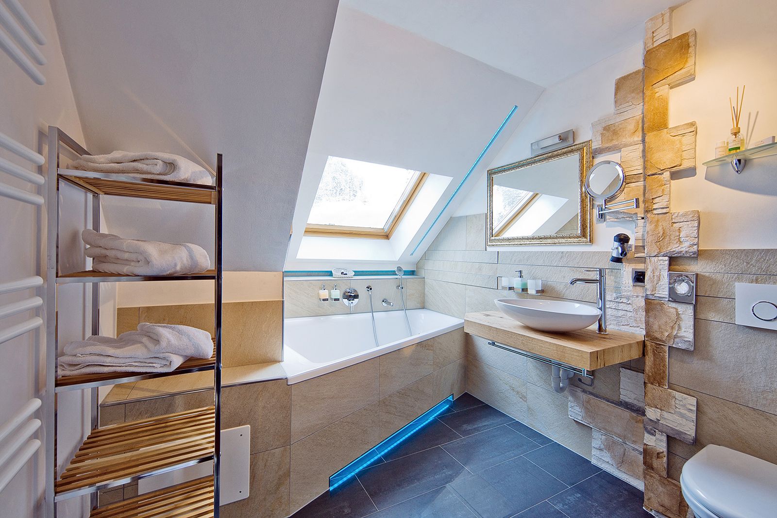 Das Badezimmer ist mit einer Badewanne ausgestattet. Die Zimmer sind buchbar für 2 Personen, ein Zimmer verfügt über ein Bettsofa für bis zu 2 Kinder.