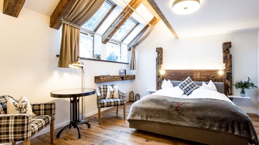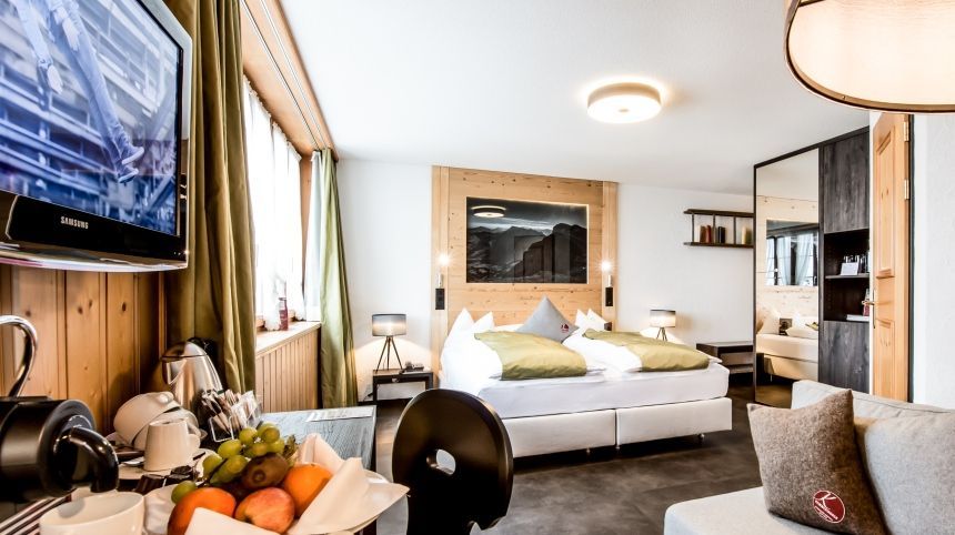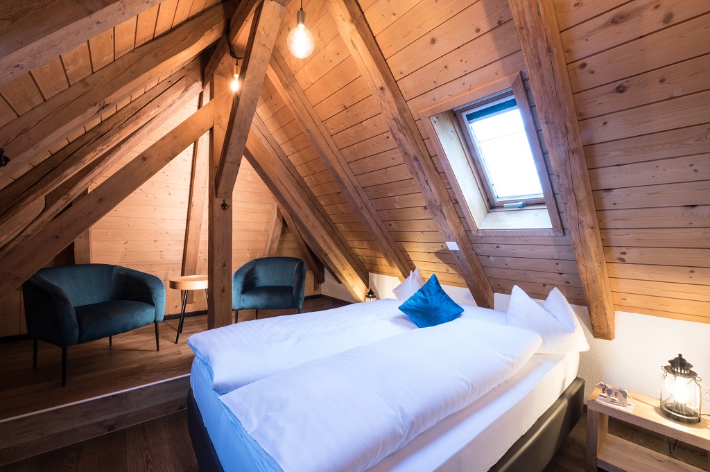 Das Zimmer Adlerhorst (40 m2) verfügt über ein Deluxe-Boxspringbett von Schramm (160 x 200 cm) aus der Reihe Cube. Das Matratzen-System bewirkt totale Entspannung und Erneuerung über Nacht sowie ein einzigartiges Bettklima. Die Obermatratze passt sich perfekt den Körperkonturen an, während die Untermatratze stabil unterfedert. Das Badezimmer ist mit einer Design-Badewanne ausgestattet. Eine Nespresso-Kaffeemaschine steht Ihnen für den morgendlichen Kaffee zur Verfügung. Ein separates Wohlfühlzimmer lädt zum Verweilen ein. Das Zimmer ist buchbar für 1 - 2 Personen und bietet Platz für 2 Kinder auf dem Sofabett.