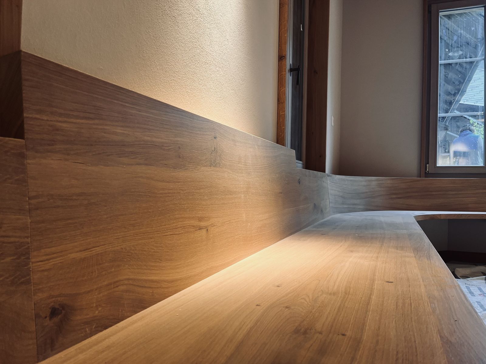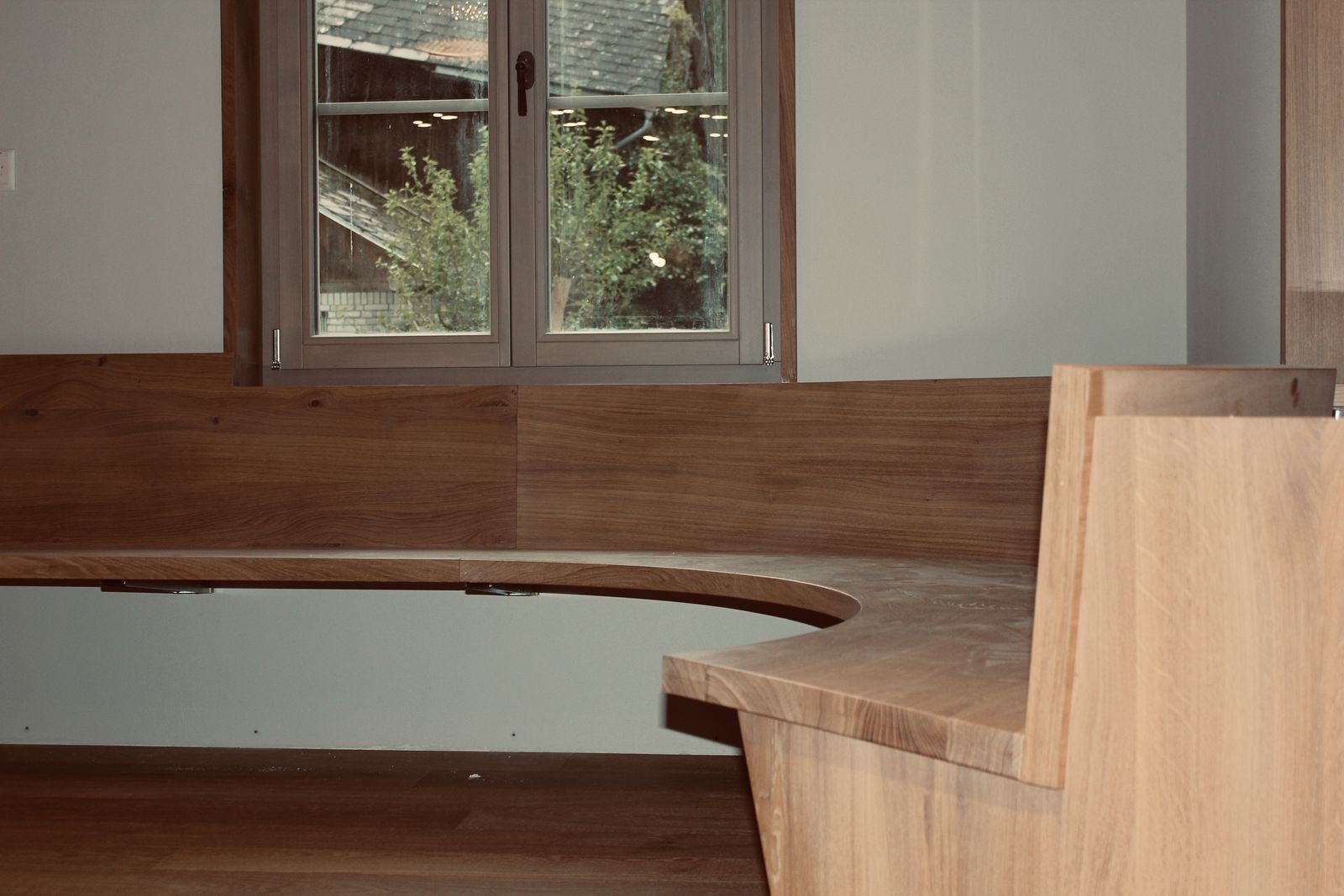 Noch vor 5 Jahren stand diese Eiche auf der saftigen, grünen Emmentaler Wiese vor Uelis Hof. Nach Jahren der Ruhe und Reifung hat die Schreinerei Fankhauser in Langnau den Eckbank unseres neuen Bedlisaals und die Fensterfutter daraus gefertigt. Die Elemente wurden persönlich von Ueli eingebaut. Eine Geste von Respekt und Stolz gegenüber des Baumes, den schon der Urgrossvater seiner Frau hegte und pflegte.